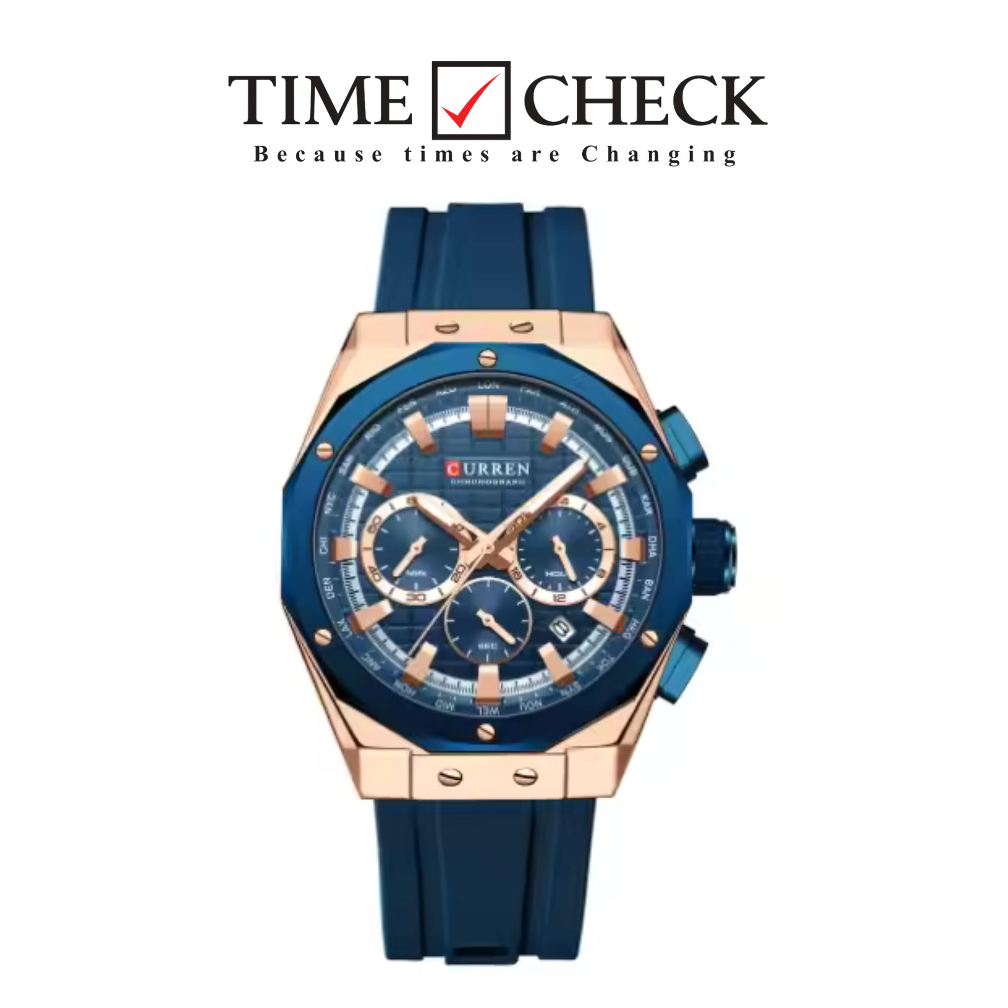 M:8464 CURREN Blue Dial Rose gold Body Blue Rubber Strap Chronograph Analog Quartz Men's Watch