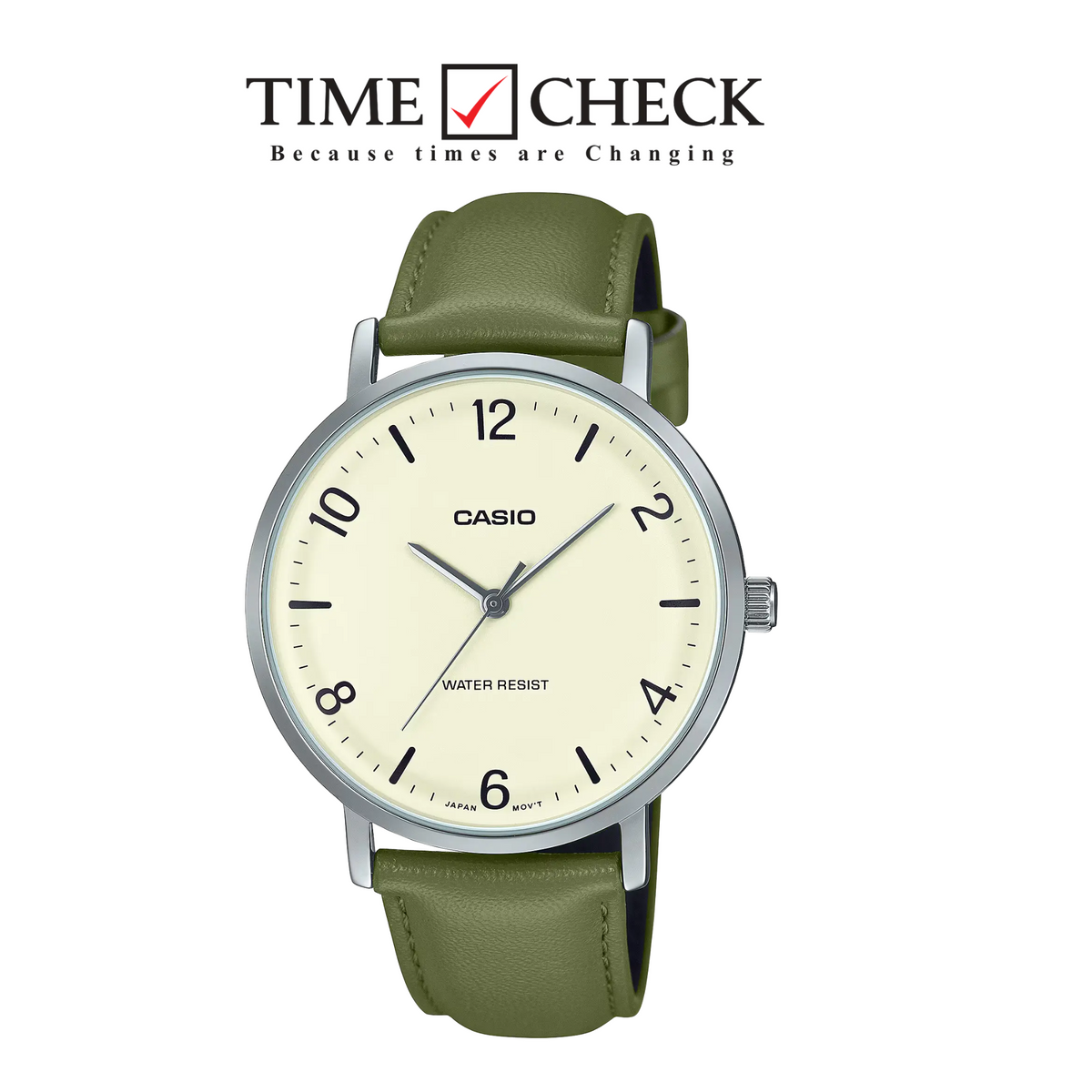 MTP-VT03L-7BDF Casio Beige Dial Steel Case Green Leather Strap Analog Men's Watch.